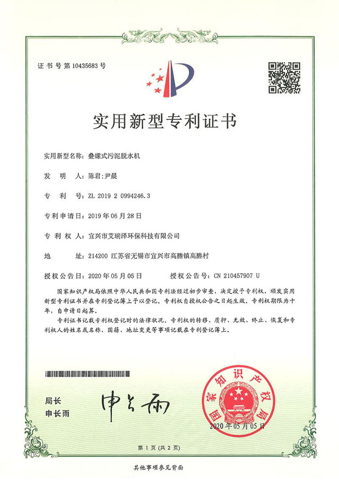 专利证书— 叠螺式污泥脱水机