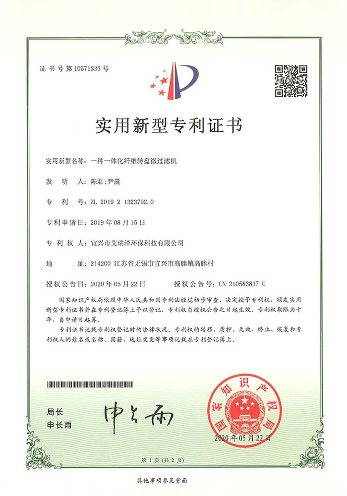 专利证书— 一种一体化纤维转盘微过滤机